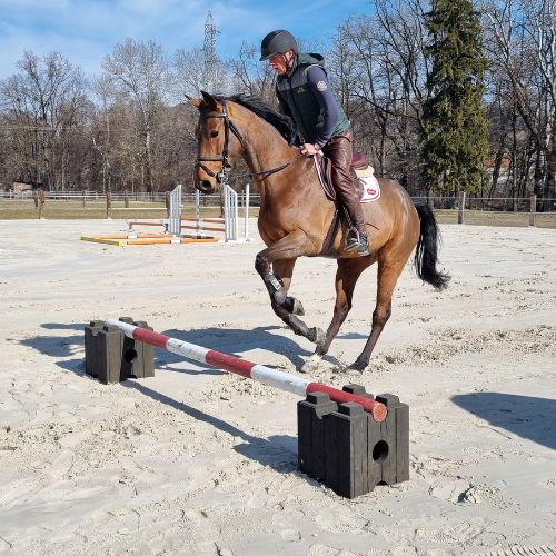 Il cavalletto a cubo consente inoltre al cavaliere di regolare l'altezza del salto, poiché i supporti sono sagomati in modo tale da poter essere impilati uno sopra l'altro, sollevando così l'ostacolo.