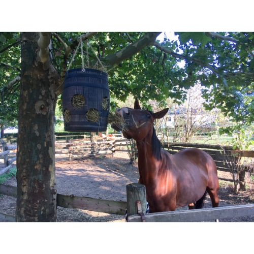 Cesta a forma di barile appendibile porta fieno in plastica